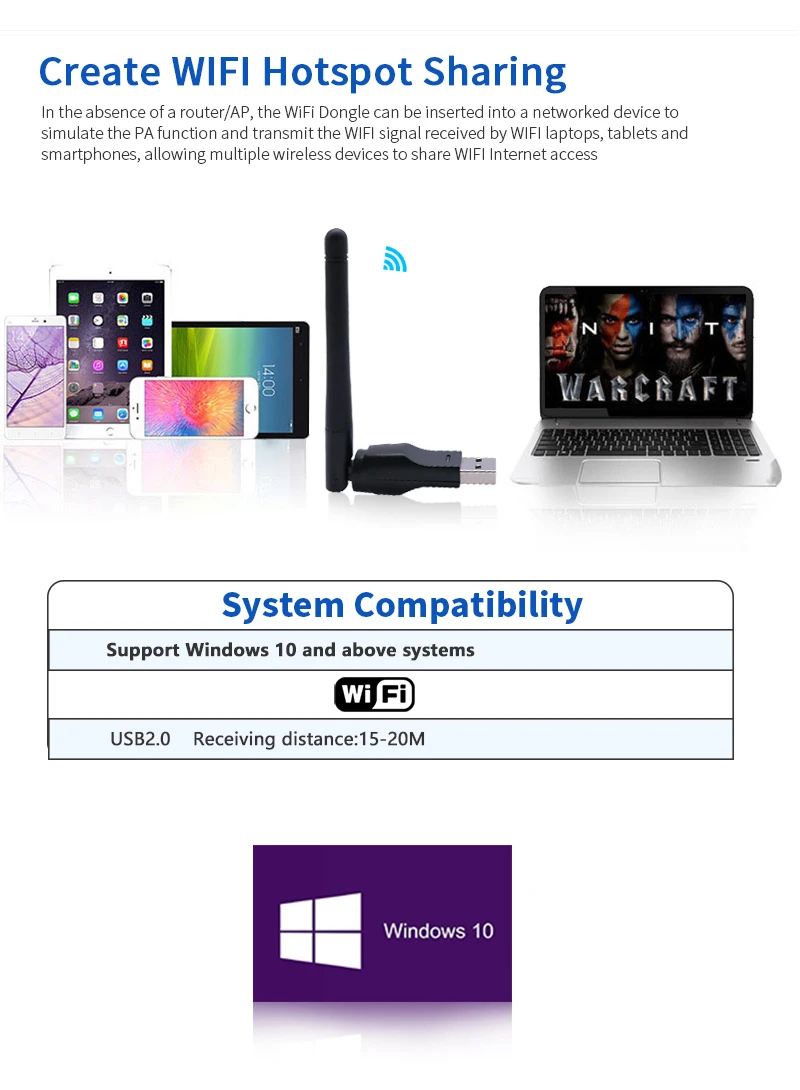 WiFi DongleMain IC:MTK7601Date Rate:150MpbsWireless Protocol:IEEE802.11.b/g/nFrequency:2.4GHzUSB Interface:USB 2.0Antenna:With AntennaColor:Red+Black