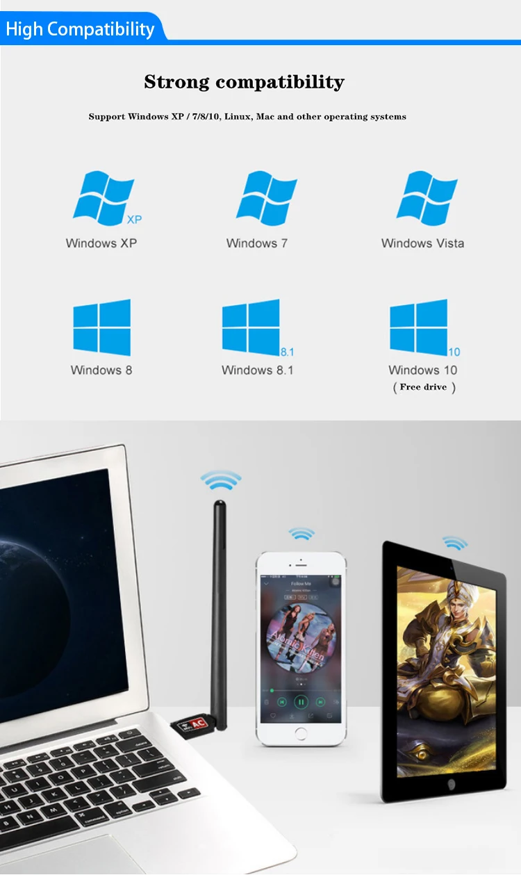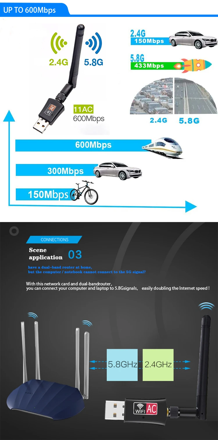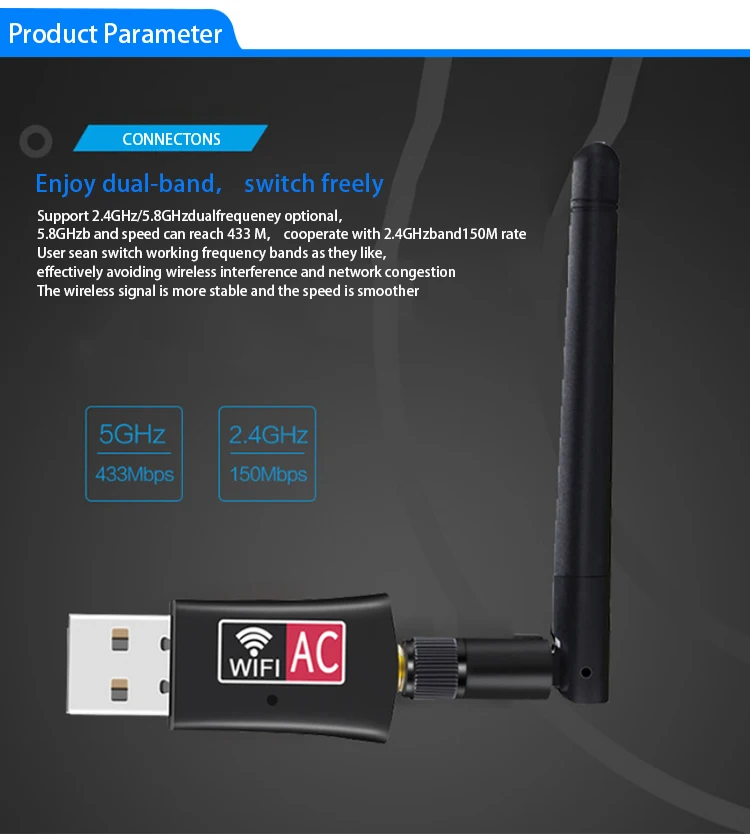 WiFi Dongle Main :ICRTL8811 Date Rate:600Mpbs Wireless Protoco:lIEEE802.11.b/g/n/acFrequency2.4GHz+5.8GHz USB:2.0USB 2.0 Antenna:With Antenna Color:Red+Black