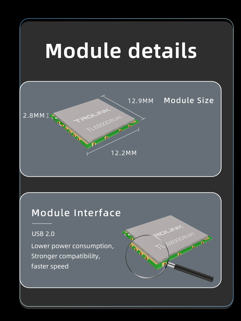 Chip: AIC8800D80 1T1R USB 2.4G+5.8G 12.2*12.9mm model:TL8800D8UA1-Z