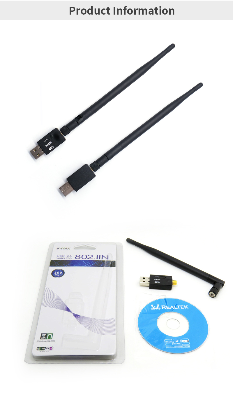 WiFi DongleMain IC:RTL8192Date Rate:300MpbsWireless Protocol:IEEE802.11.b/g/nFrequency:2.4GHzUSB Interface:USB 2.0Antenna:With AntennaColor:Black